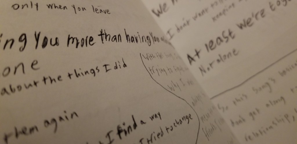 I was moved to send a message of encouragement to the artist and, later, to make a contribution, which is the reason I’m now in possession of a cassette combining the releases Welcome To The Club, Granillo, and Wish I Could Say (parts 5-7 of what Dandy has amusingly dubbed his “AM Collection”). Upon unboxing, I saw that the artist had hand-decorated a blank white tape with swarming black designs, including symbols of the domestic and quotidian (a lamp, a chair, a door) which are recurring motifs in his idiosyncratic oeuvre – and he had included a handwritten lyrics zine complete with commentary on each song. Seeing it I immediately reflected on the fading art of penpal-ing. I was also carried back to the old thrill of writing illicit notes in class – the soft crush of graphite or satisfying seep of felt tip on loose leaf, the wild innovation of doodles and scribbles, the revelatory outpourings. And, again, I remembered all those early Daniel Johnston tapes circulating out there, each one different from the next.