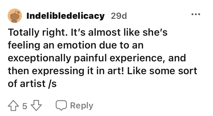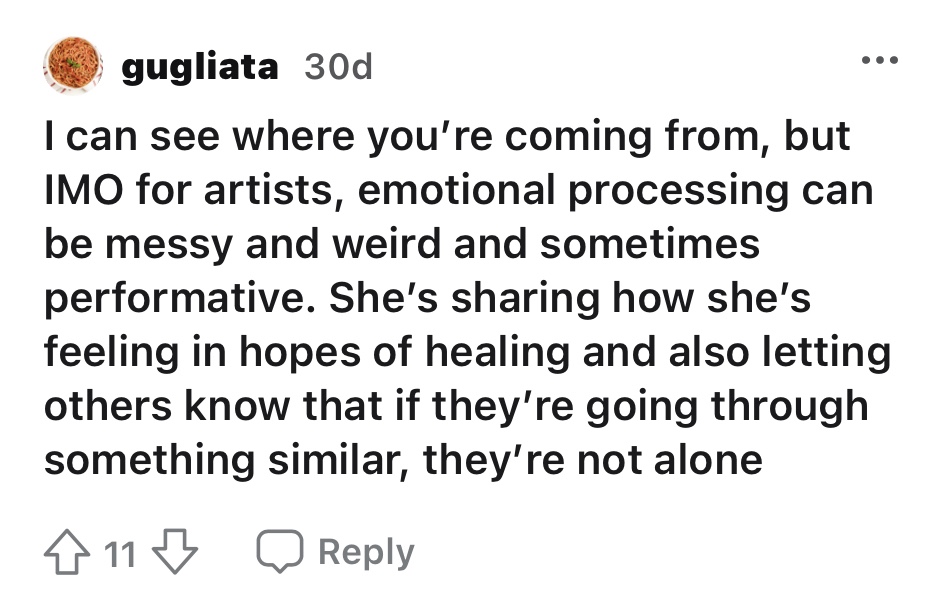 To put a cap on this roiling mishmash: I am an artist. I make art from personal experience because it’s the only thing I feel I know intimately enough to represent. When people hurt my feelings, I portray that, too, because it would be absurd to omit noteworthy experiences from my art. I would make art even if no one could see it, but because I have the means to put it in front of people, I do that, in the hopes that it lights someone up or sees someone through the way others’ art has done for me. It’s an unstoppable impetus.